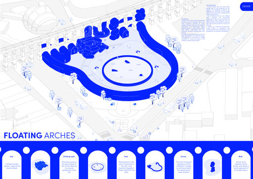 A proposta busca dialogar com os vazios dos arcos e preencher o vazio da praça.