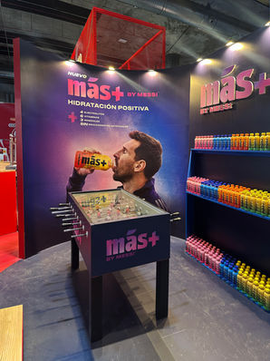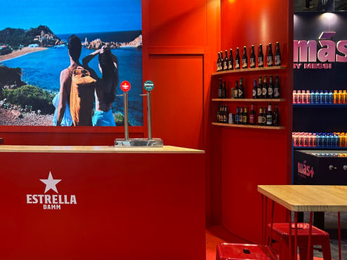 El diseño del stand busca equilibrar la identidad visual de tres marcas, manteniendo una coherencia estética y funcional en el espacio.
